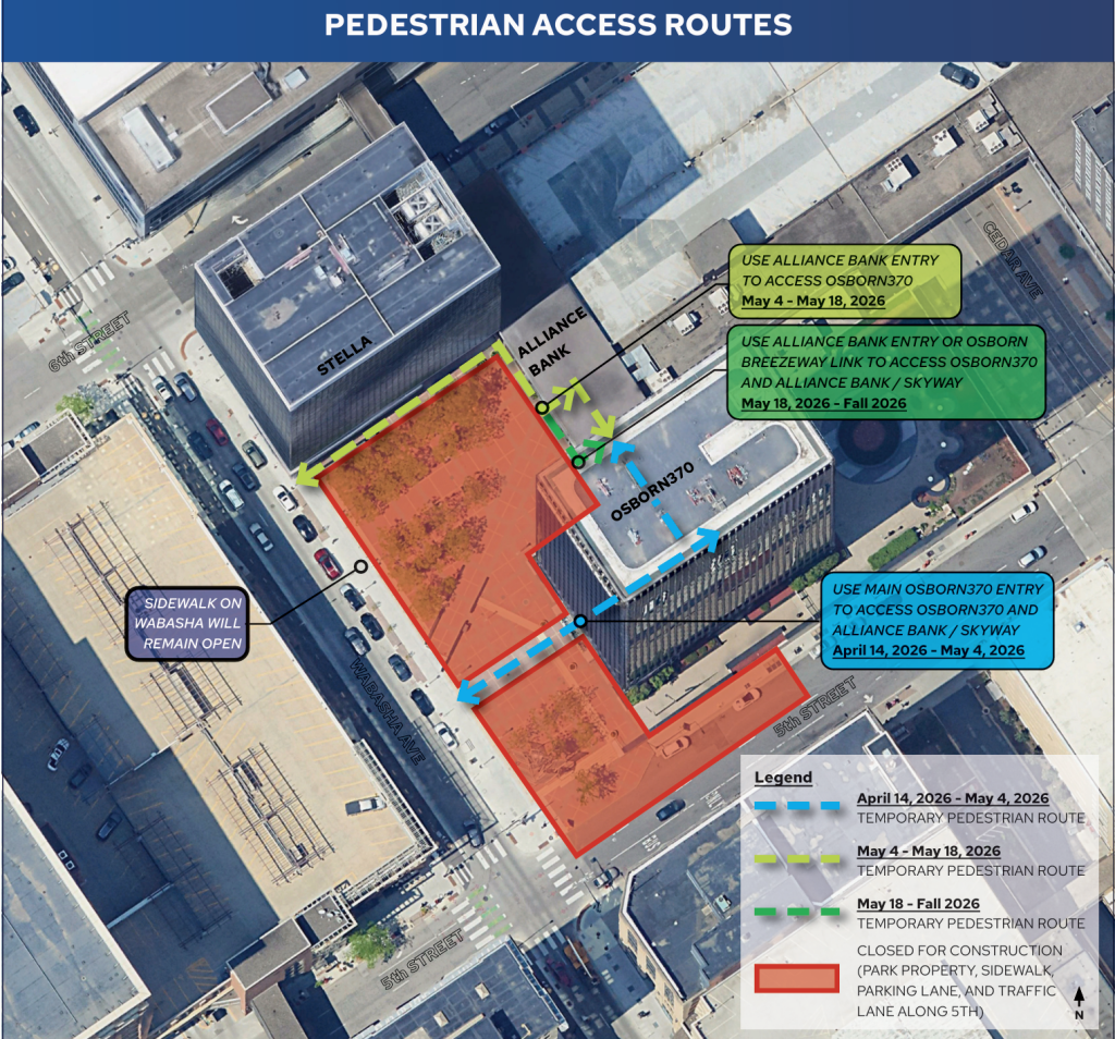 Important Notice: Pedestrian access to the Osborn 360 building has undergone temporary changes due to the ongoing Osborne Plaza Improvements Project. Please take a look at the image below, which highlights the current pedestrian access route in blue. These temporary updates provide a more direct access to the building lobby.